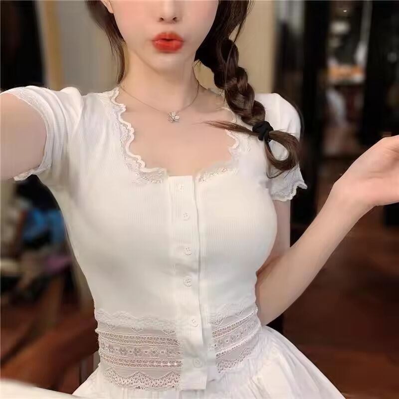Summer 2024 New Women's Lace Short Sleeve T-Shirt Spicy Girl Short Slim Fit Solid Color Hotsweet Temperament Versatile Top